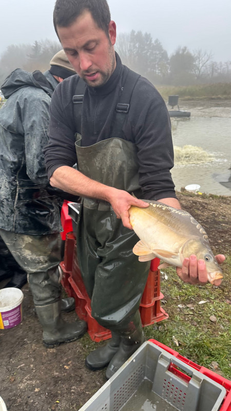 6 ou 7 pêcheurs trient les poissons par espèces (pas toujours reconnaissables pour nous), puis les mettent par catégories dans des cuves oxygénées sur un camion qui les transportera jusqu’à leur lieu de destination (l'Est de la France ou l'Allemagne) où ils arriveront vivants. Les alevins seront remis dans un étang aménagé spécialement pour les protéger des oiseaux. (comme à gauche du green du 15 du Breuil).